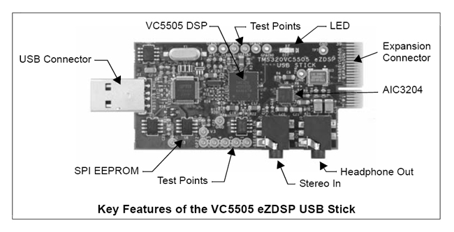 The VC5505 eZDSP USB stick is an evaluation tool for the Texas Instruments' TMS320VC5505 digital signal processor. This USB bus powered tool allows the user to evaluate the following items: